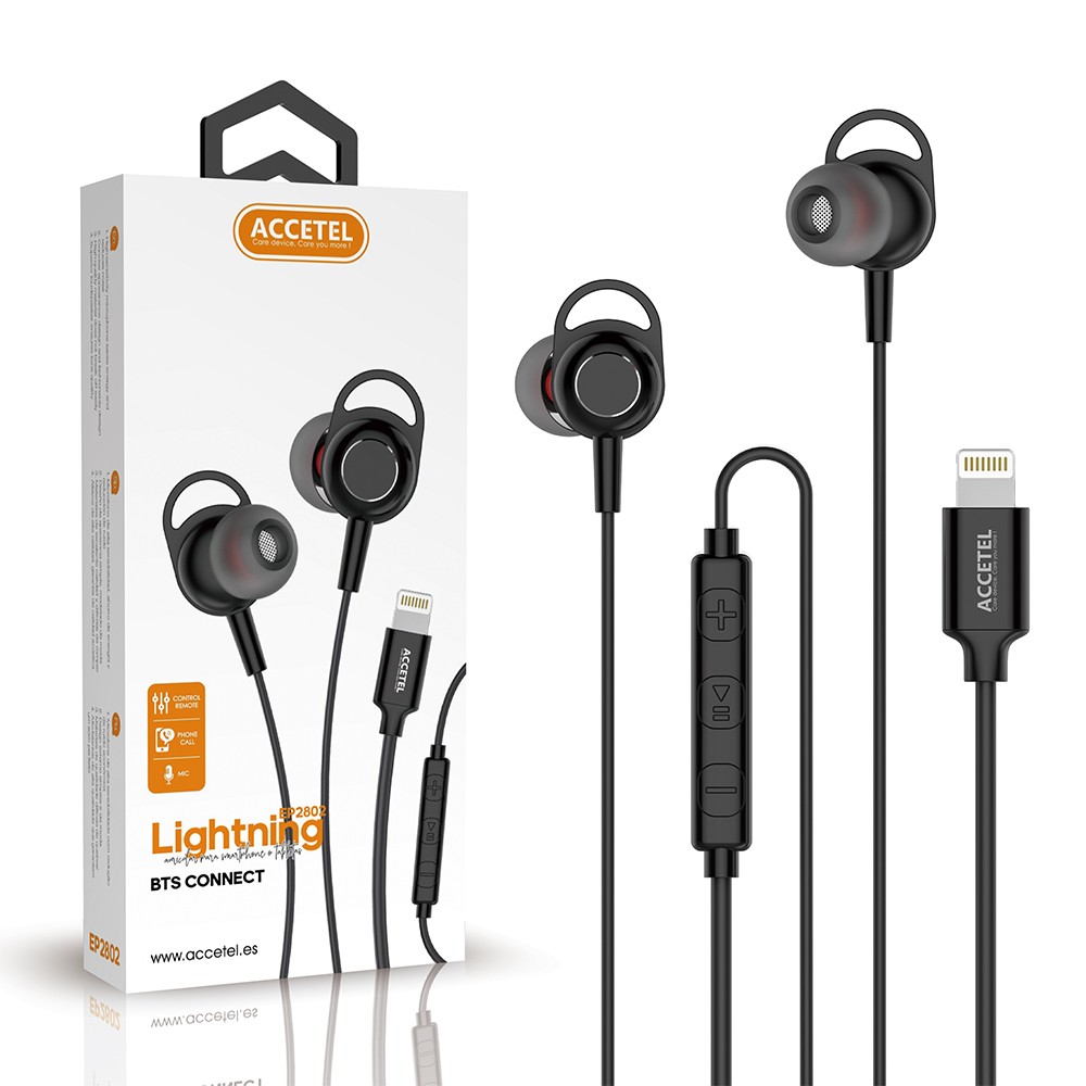 Disfruta de un sonido claro y de alta calidad con los EP2802, los auriculares con cable de Accetel que cuentan con micrófono integrado y un botón multifunción para una experiencia de uso cómoda y práctica. Perfectos para música, llamadas y uso diario, estos auriculares son ideales para cualquier dispositivo con conexión Lightning (Bluetooth), eliminando la necesidad de adaptadores.