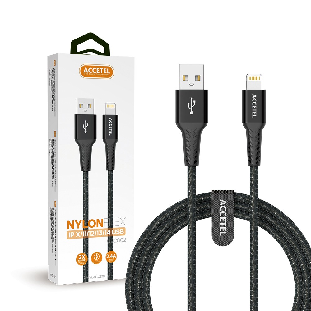 CU2802 Cable Datos Nylon Flex 2.4A – USB a Lightning (1M) Negro Cable de Carga y Transferencia de Datos