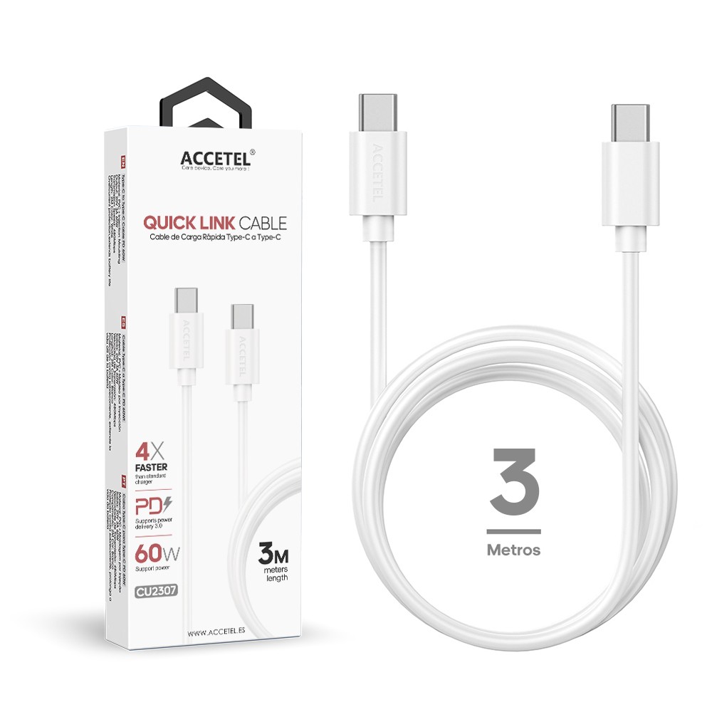 CU2307 Cable Carga Rápida 60W Type-C a Type-C Max.20V 3A (3M) Blanco Cable de Carga Rápida y Transferencia de Datos