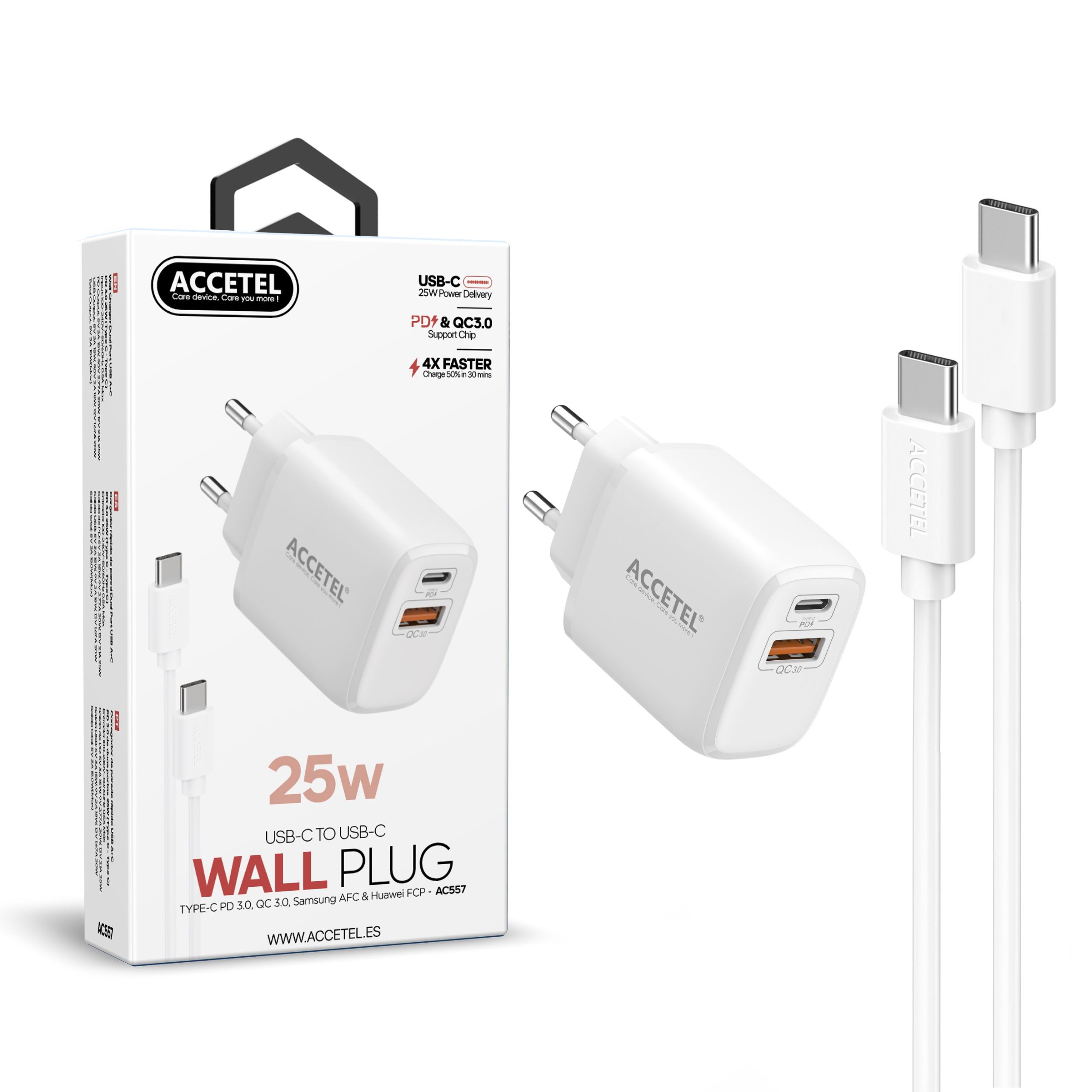 Con la tecnología Quick Charge (QC) + Power Delivery (PD), el Cargador de Pared AC557 proporciona una carga increíblemente rápida con una potencia de hasta 25W, reduciendo significativamente el tiempo que tus dispositivos necesitan estar conectados. Con un amperaje máximo de 3.0A y un voltaje máximo de 12V, el cargador proporciona una carga potente y eficiente. Equipado con un puerto de salida USB-A + USB-C, es compatible con una amplia gama de dispositivos, desde smartphones hasta tabletas, garantizando una experiencia de carga versátil y universal. Además, incluye un cable USB-C de un 1 metro de longitud