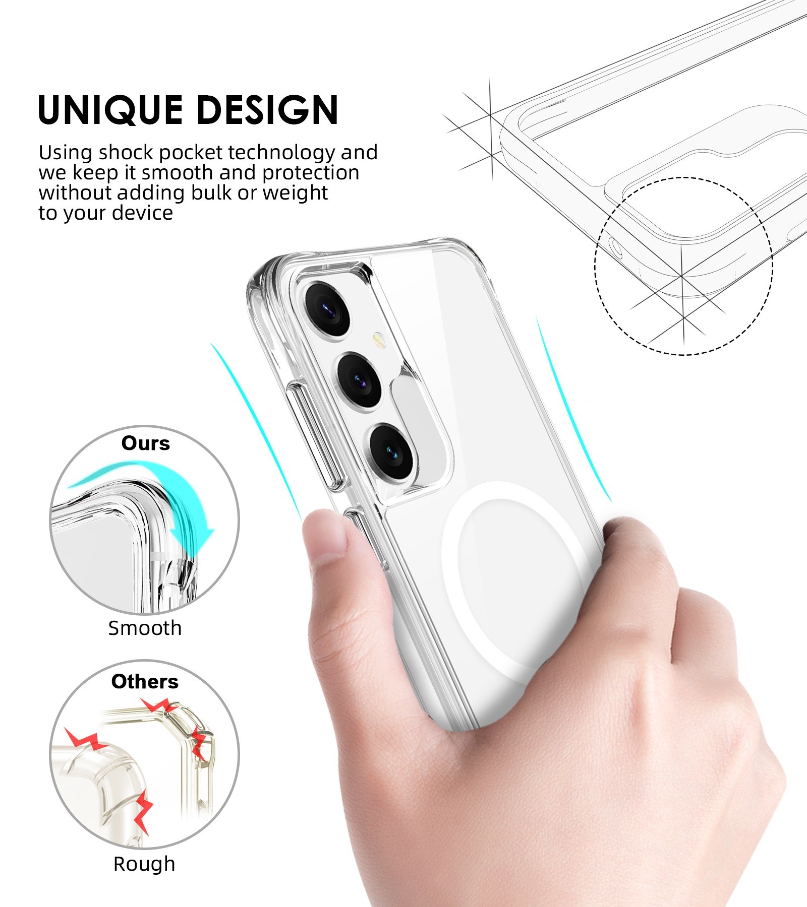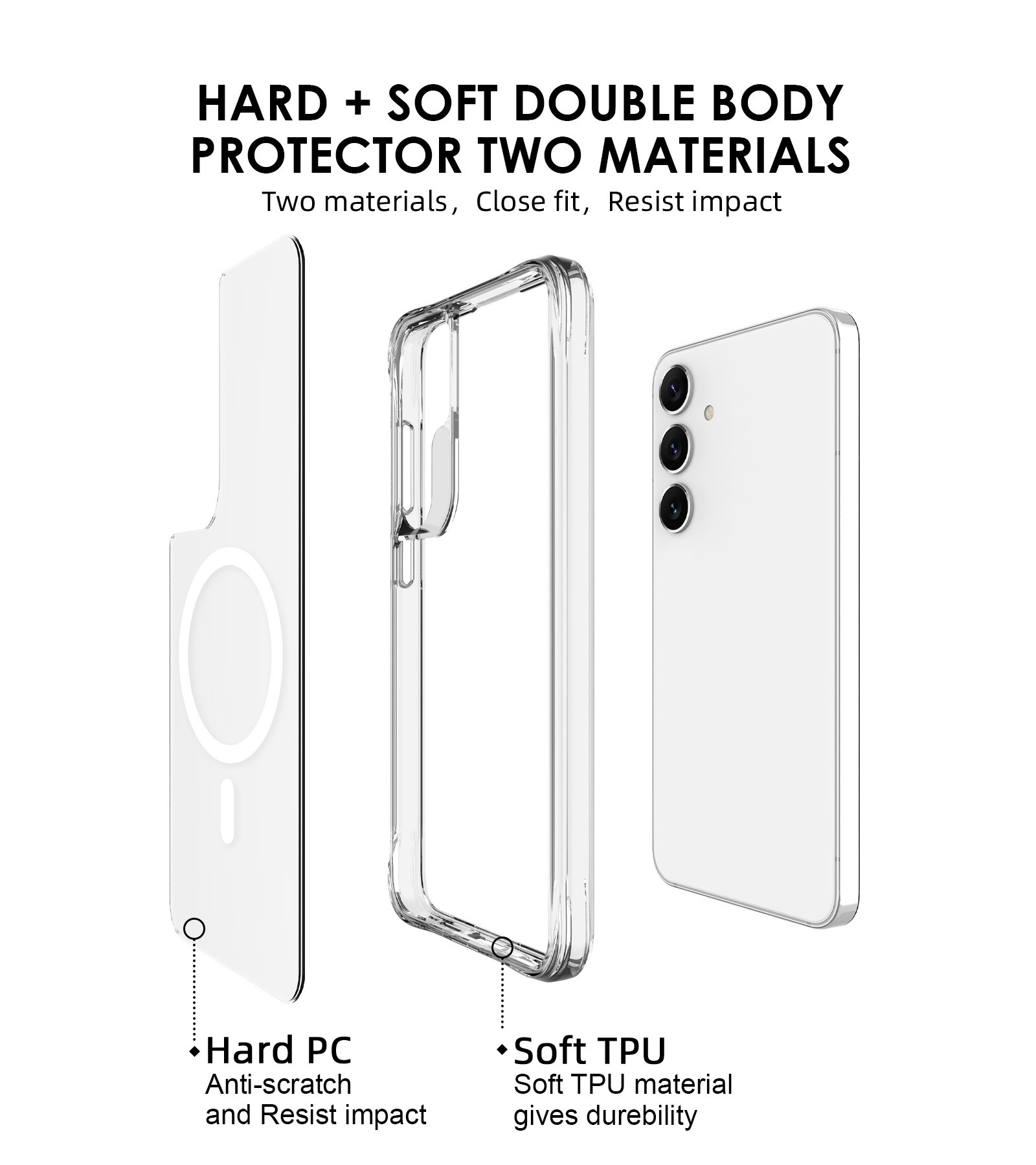 La funda antigolpe para Samsung Galaxy S24+ 5G está construida con un material que no se pone amarillo con el tiempo, garantizando que mantenga su apariencia clara y nueva incluso después de un uso prolongado. Este material avanzado proporciona una protección robusta contra golpes y caídas, asegurando que tu dispositivo esté siempre en las mejores condiciones. Esta funda cuenta con imán en la parte trasera, permitiendo cargar tu dispositivo de forma inalámbrica y utilizar cualquier accesorio compatible con la tecnología Magsafe